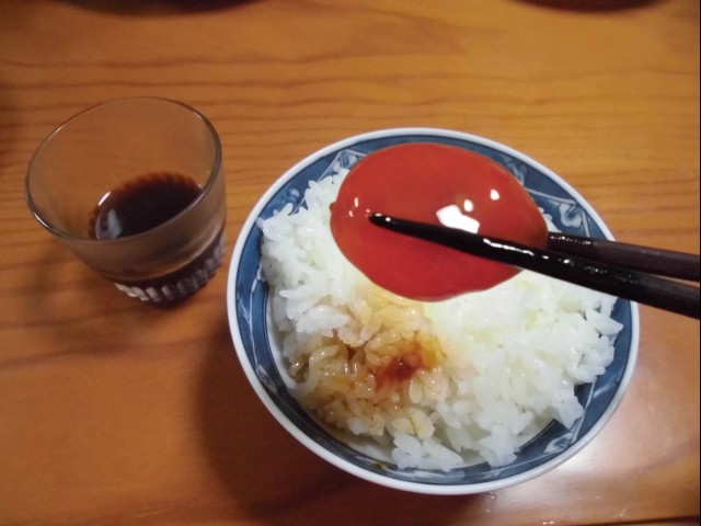 黄身を割ってみると、中まで醤油色にはなっていなかった。