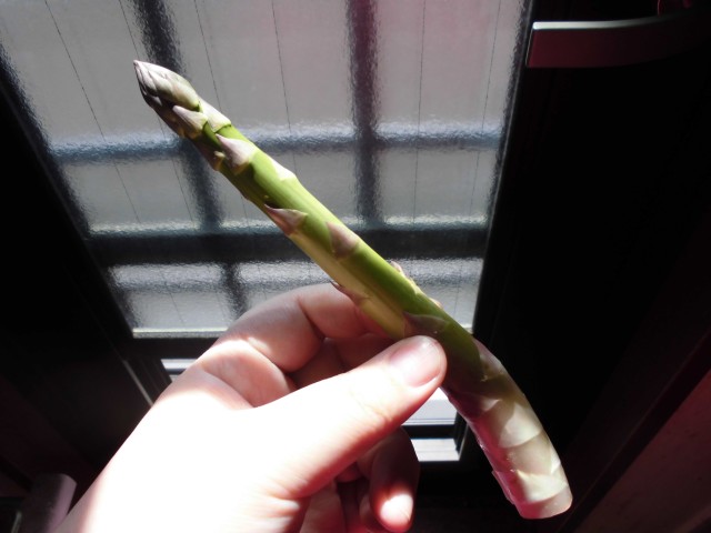 夫の人が、昼休みに帰ってくる時、庭のアスパラを収穫してきた。