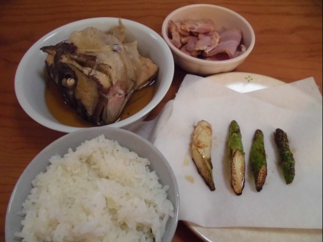 ↑鯛お頭煮・焼き豚切り落とし・ご飯・アスパラ素揚げ。