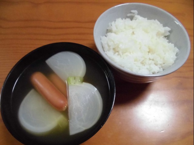 ↑夜ご飯。ウインナーかぶコンソメスープ・ご飯。