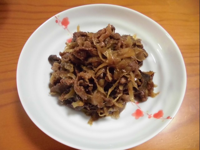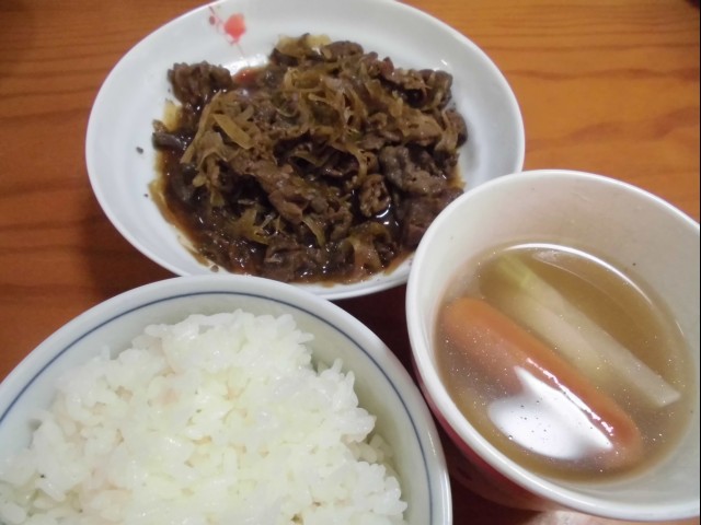 ↑昼ご飯。牛ゴボウ・ご飯・スープ。