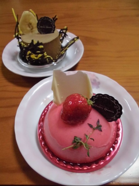 ↑奥・夫の人のチョコバナナムース。手前・はすのイチゴババロア。