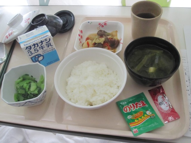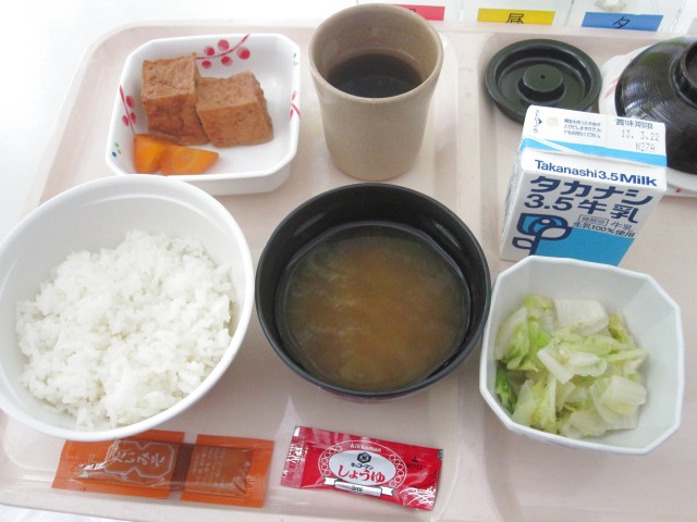 ↑朝ご飯。ご飯・味噌汁・生揚煮付け・おひたし。
