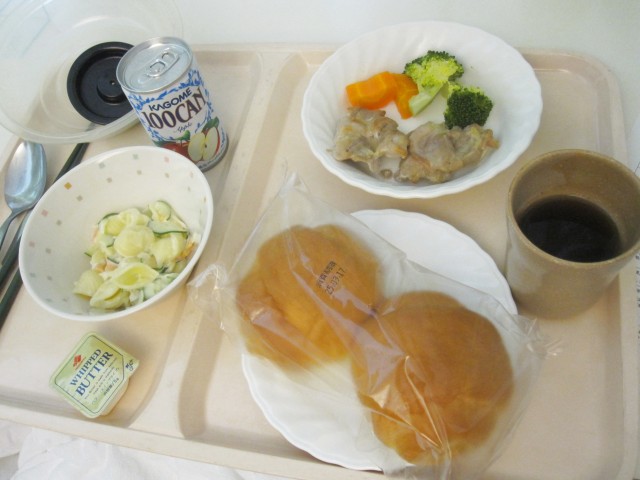 ↑昼ご飯。パン・ローストチキン・マカロニサラダ・リンゴジュース。