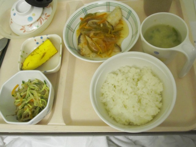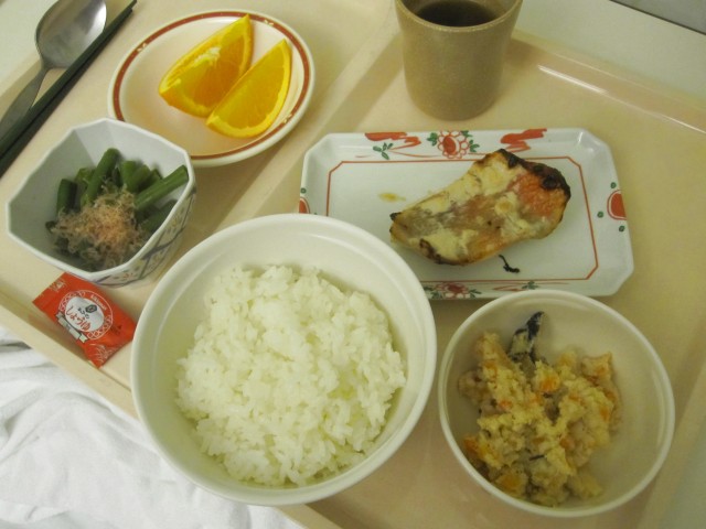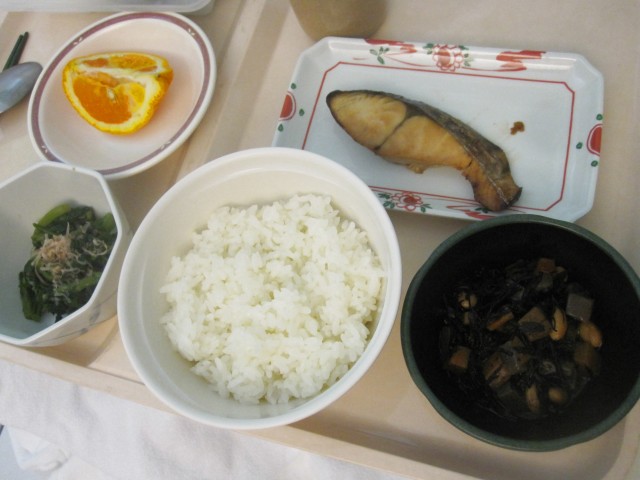 ↑昼ご飯。ご飯・サワラ照り焼き・おひたし・ひじき煮・デコポン。