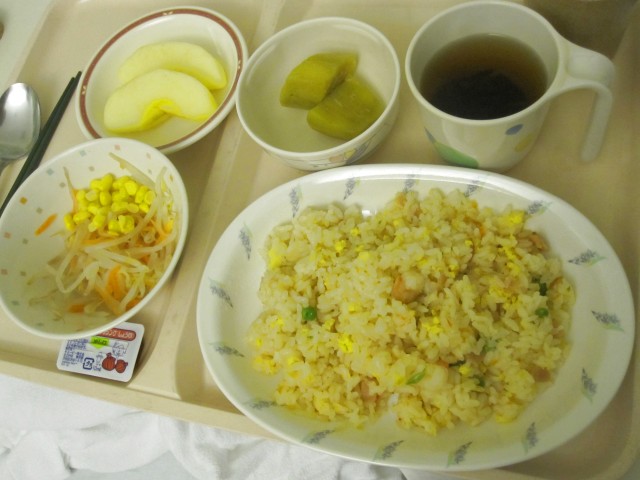 ↑夜ご飯。チャーハン・さつま芋甘煮・スープ・サラダ・リンゴ。