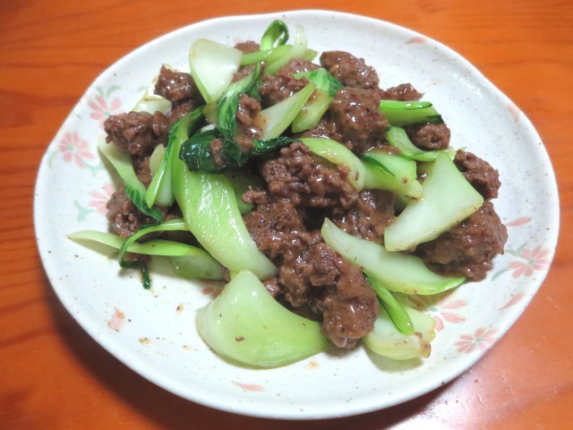 ↑味噌汁・ご飯・牛肉のガリバタ炒め。