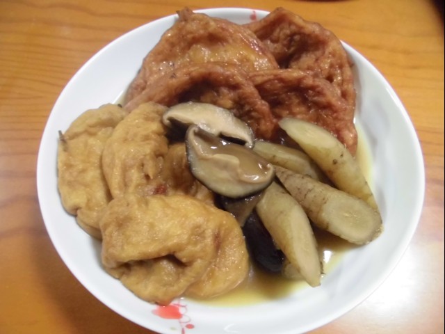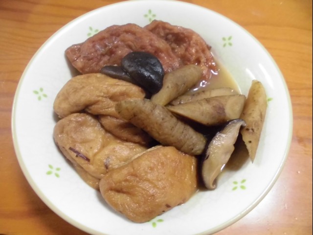 ↑ゴボウ・しいたけ・さつま揚げ・がんもの煮物。