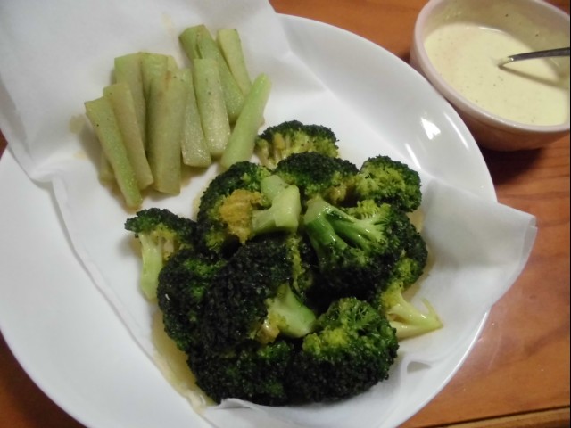 ↑ブロッコリー素揚げ。マヨチーカレー風味ソースで。
