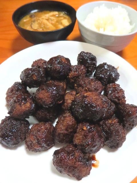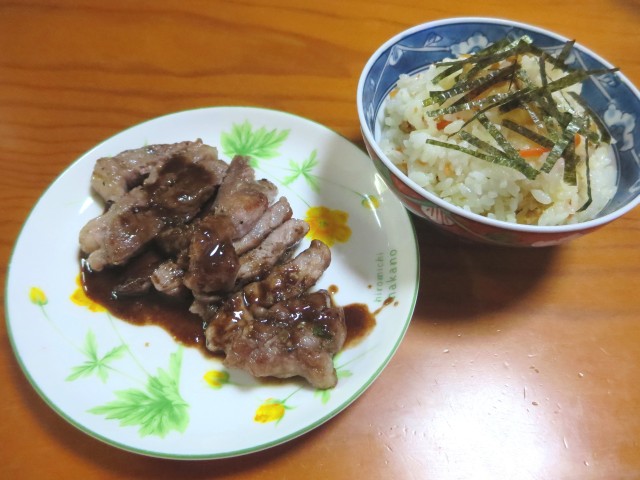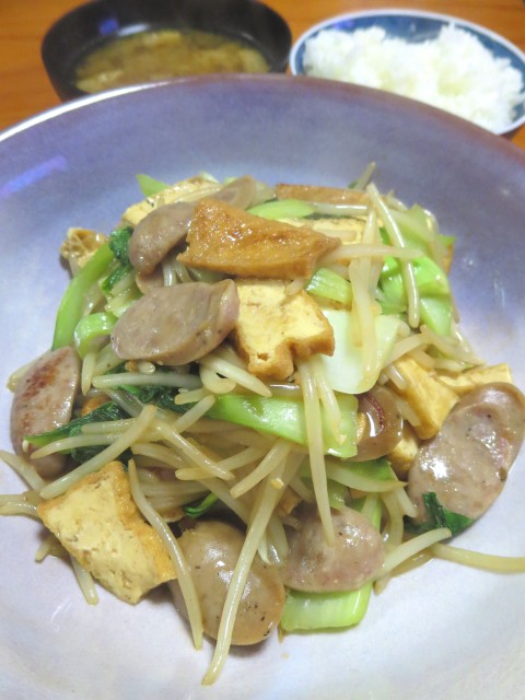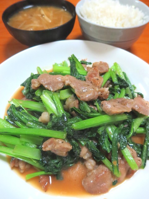 ↑夜ご飯。味噌汁・ご飯・豚肉と小松菜の炒め物。