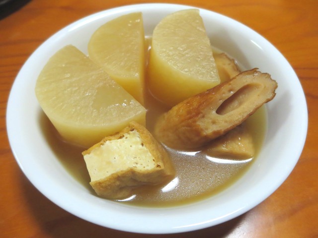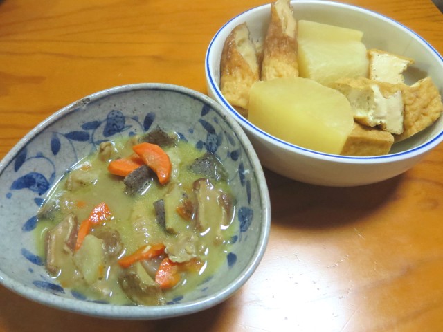 ↑モツ煮・ちくわ大根厚揚げの煮物。
